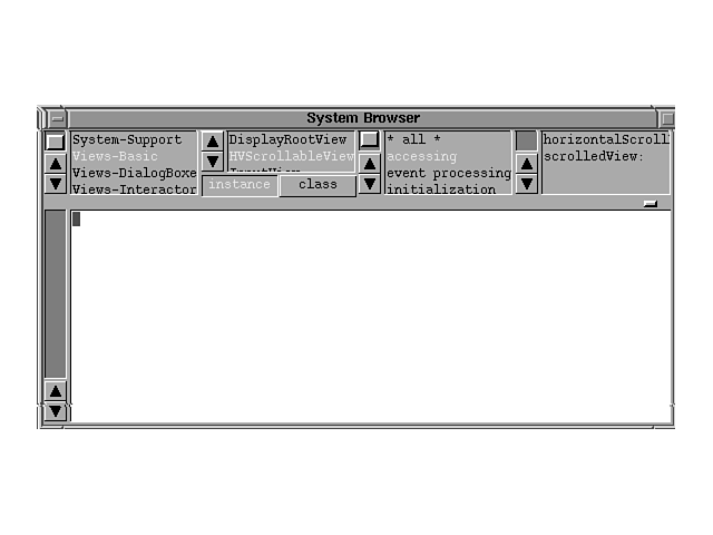 subview is the second section from the far left of the system browser. You can also select one of two special categories: all *which selects all classes and lists them alphabetically; and *hierarchy,