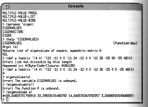 The variables in LISP-STAT are not case-sensitive. Note the single quote (') before the list of numbers for the matrix. If you omit the quote, the list will be evaluated and replaced with the result of the evaluation. By leaving the single quote in