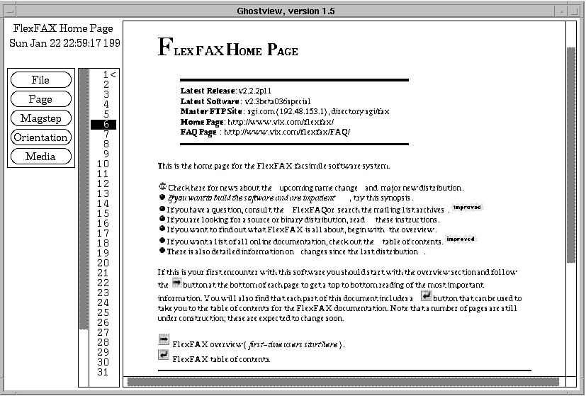 See Figure 25.1 for the input to the interpreter. (Your version number may be different than that shown in the figure.) The output is shown in a separate window as shown in Figure 25.2 (which shows the FlexFAX FAQ). The file in this example is the FAQ